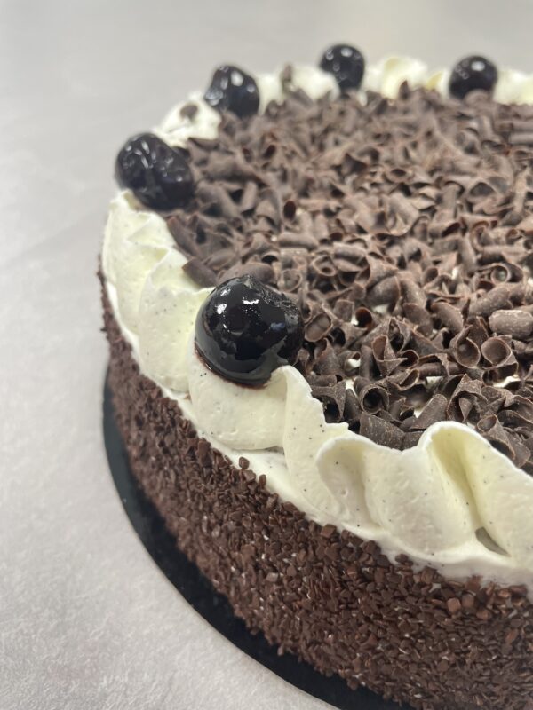 Génoise cacao, chantilly vanille de Madagascar, cerise AMARENA, copeaux de chocolat noir.