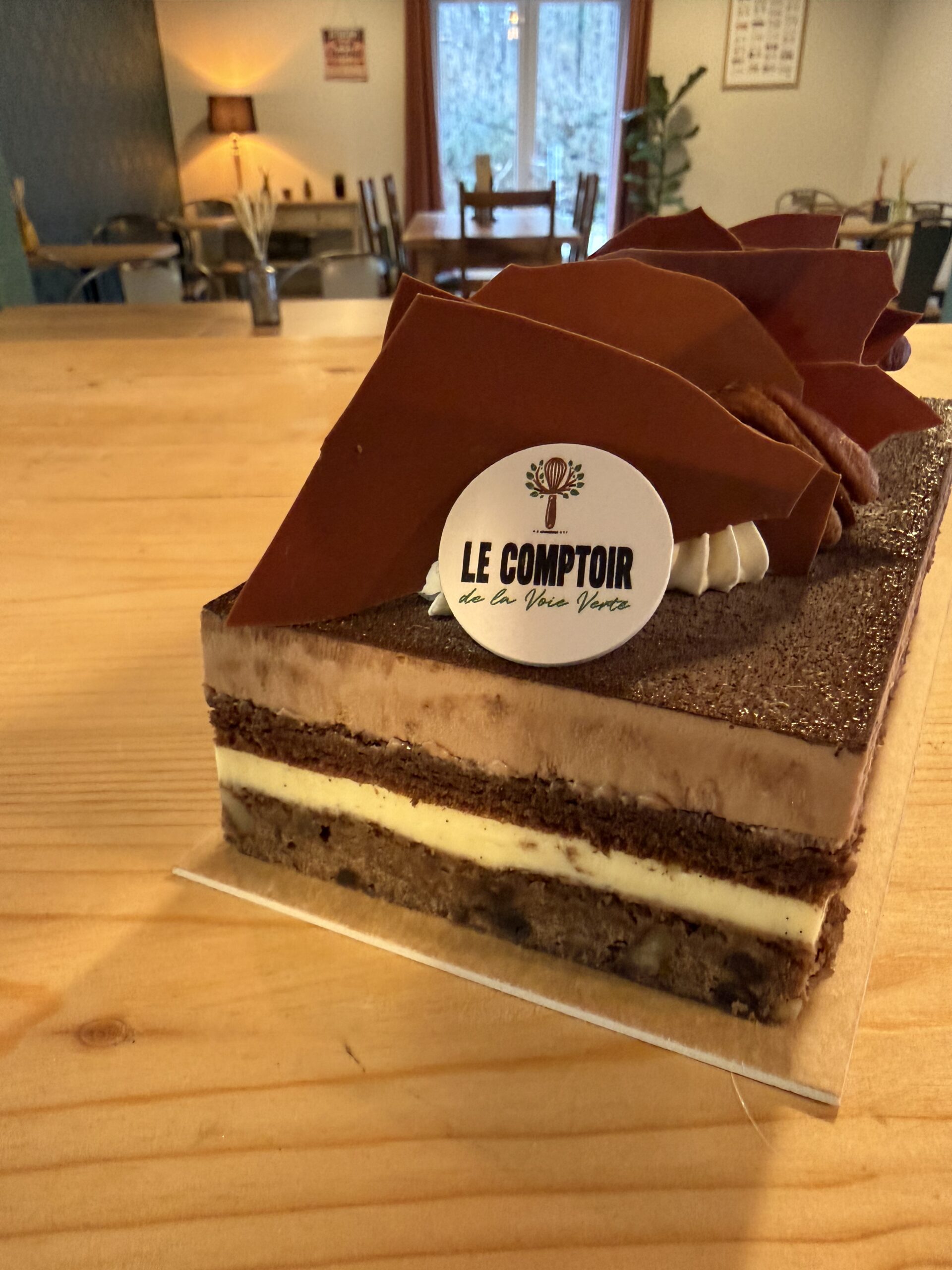Biscuit brownies chocolat et noix de pécan, crémeux vanille de Madagascar, biscuit viennois cacao, mousse allégée au chocolat au lait 41%.