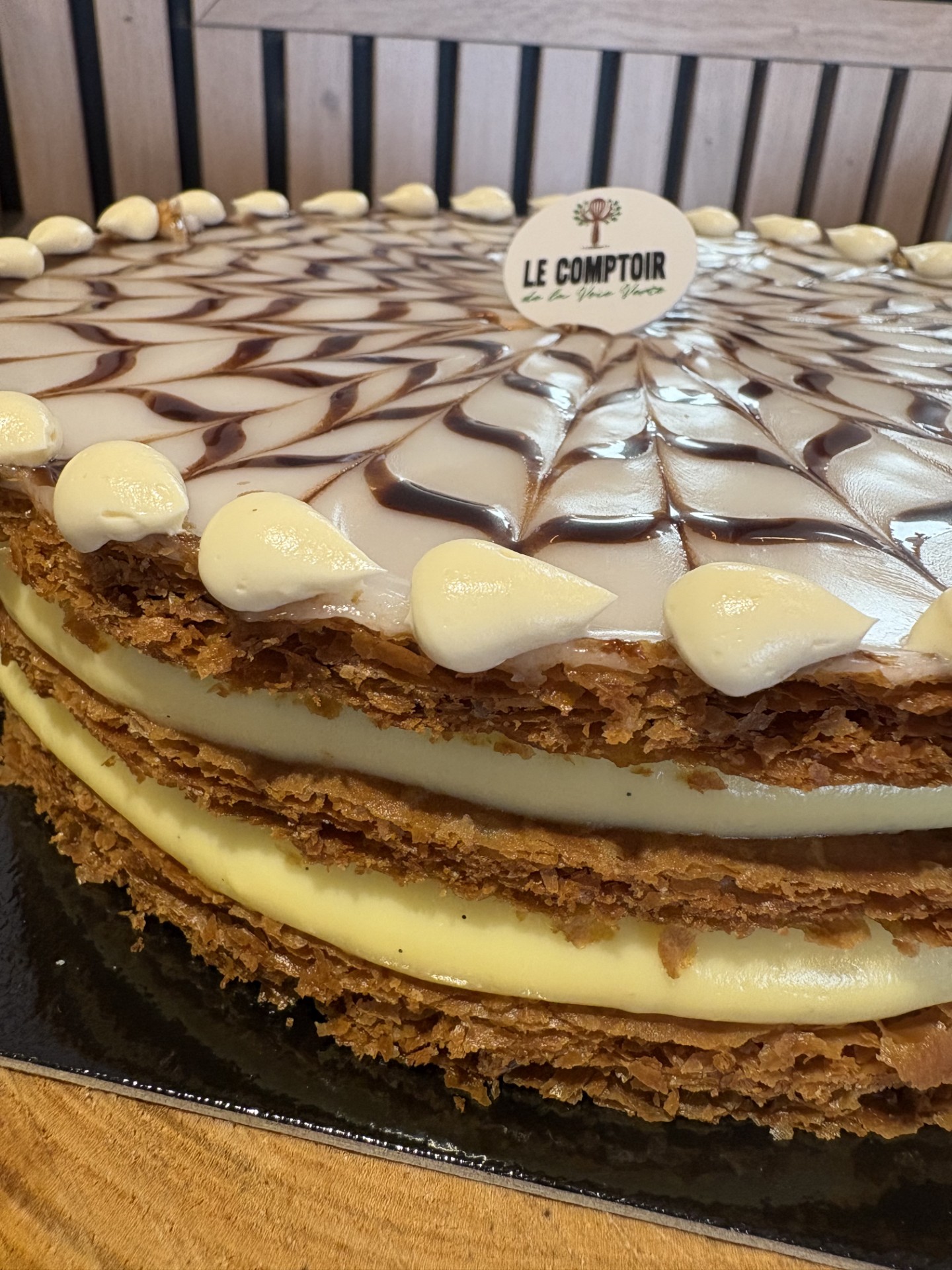 Pâte feuilletée caramélisée, crème pâtissière à la vanille de Madagascar, glaçage traditionnel au fondant ou finition au sucre glace au choix.