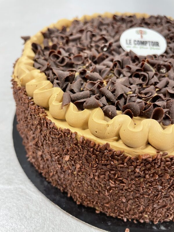 Génoise moelleuse imbibée au café, crème au beurre café, copeaux de chocolat noir.