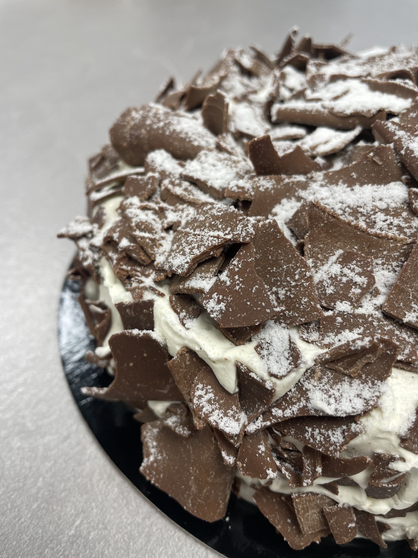 Génoise moelleuse, sirop à la vanille, disque de meringue, chantilly à la vanille de Madagascar, copeaux de chocolat au lait.